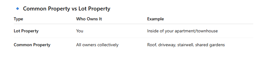 - Covers common areas (roof, walls, lifts, etc.) — managed by the body corporate.
